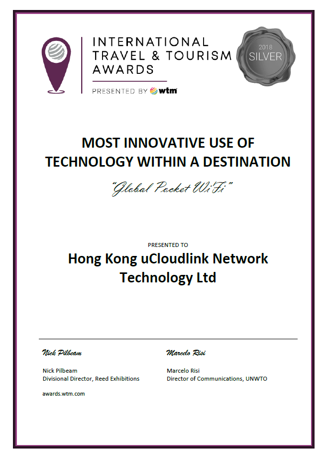 [英国.伦敦] 2018年11月6日; 由全球知名的世界旅游市场展会组委会World Travel Market(WTM)主办的首届 “国际旅游及旅游业大奖” ,在英国伦敦烟草码头隆重举行。颁奖仪式设在2018 WTM London展会期间,众多旅游企业负责人、社会名流和行业大咖亲临现场。这是由全球旅游业顶级展会主办方颁布的国际旅游大奖,极具权威性。优克联uCloudlink凭借自主研发的云卡技术和其综合影响力,推出GlocalMe「零漫游」全球移动Wi-Fi,并从82 家入围企业中脱颖而出,荣获“目的地最具创新应用科技大奖”银奖。